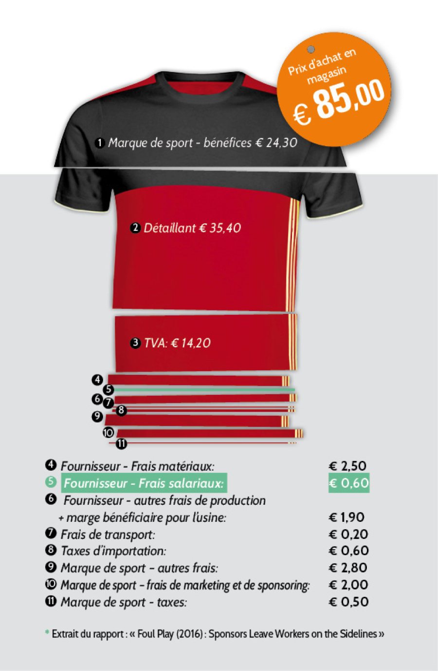 Les chiffres d’affaires de Nike et Adidas ont augmenté quatre fois plus vite que le secteur de l’habillement sur les dix dernières années. La marge bénéficiaire des deux marques a été multipliée par 2,5, et les dividendes versés aux actionnaires ont même été multipliés par 3 dans le cas de Nike, devenu l’une des valeurs de référence de la bourse de Wall Street. Est-ce que les travailleurs en Asie profitent eux aussi de cette bonne santé économique ? Ils n’en voient même pas les miettes. En Indonésie, une travailleuse qui fabrique des chaussures Adidas gagne moins de la moitié du salaire minimum vital. Avec son salaire, elle ne peut simplement pas couvrir les besoins de base de sa famille. Les ouvrières asiatiques qui ont fabriqué un maillot Adidas pour une des équipes qualifiées au Mondial gagnent moins d’1 € par maillot... vendu 85 € ou plus chez nous ! (voir ci-dessous)
