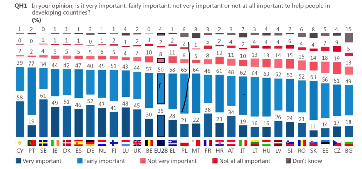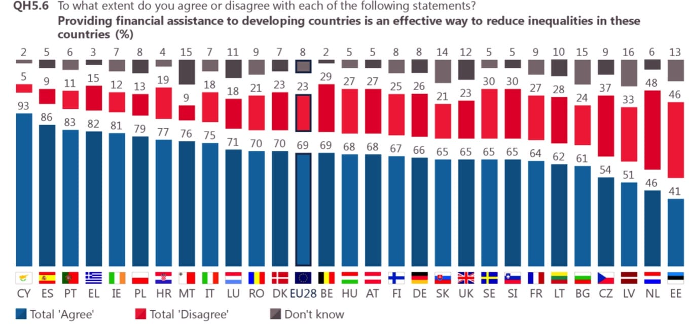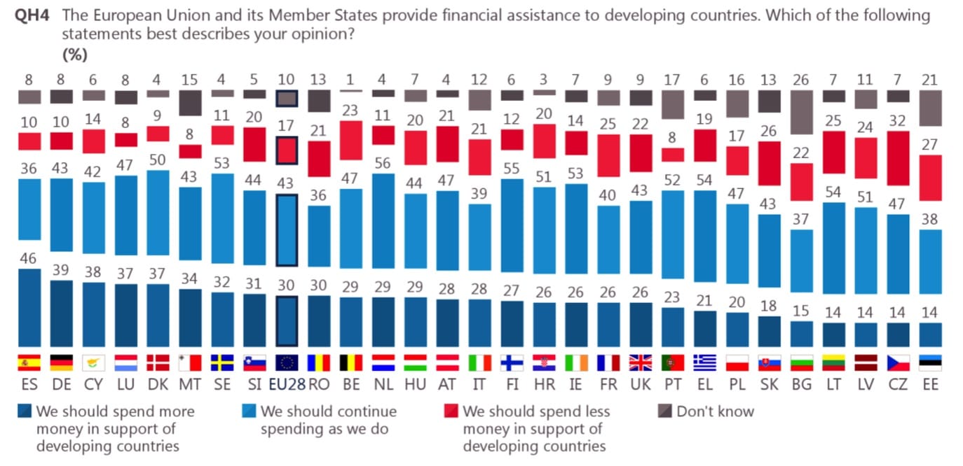 Il n’est donc pas surprenant que 73% des personnes interrogées pensent que l’UE et les Etats membres devraient continuer à financer l’aide pour les pays en développement, à des niveaux équivalents ou plus élevés qu’actuellement. En d’autres mots : plus de 7 personnes sur 10 pensent que l’on devrait au minimum continuer ou même augmenter l’aide au développement en soutien aux pays du Sud.